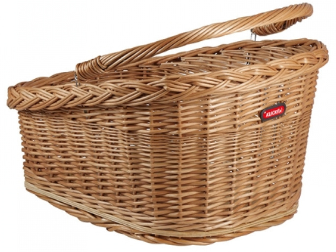 Klassischer Längskorb aus Naturweide mit klappbarem Griff und versiegelten Holzboden. Erhältlich in zwei Befestigungsvarianten.