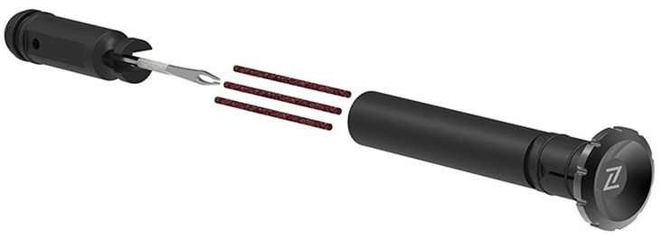 Z Bar Plugs ist ein im Lenker integriertes Reparaturset für schlauchlose Reifen. Lenkerkompatibel: Innendurchmesser zwischen 17,5 mm und 21 mm. Es besteht aus 2 integrierbaren Lenkerenden. In einem Ende befinden sich ein Einführwerkzeug sowie 3 Reparaturstreifen mit einem Ø von 5 mm, während das andere Endstück ein Messer und 3 Reparaturstreifen mit einem Ø von 2 mm enthält. Die Verriegelung am Lenker erfolgt ohne Werkzeuge, durch Drehen des Aluminium-Endstücks. Jedes Element lässt sich je nach Wunsch des Benutzers rechts oder links installieren. Der Z Bar Plugs bietet Mountainbikern mit schlauchlosen Reifen eine dauerhafte Lösung, die sie für den Pannenfall an ihrem Fahrrad mitführen können.