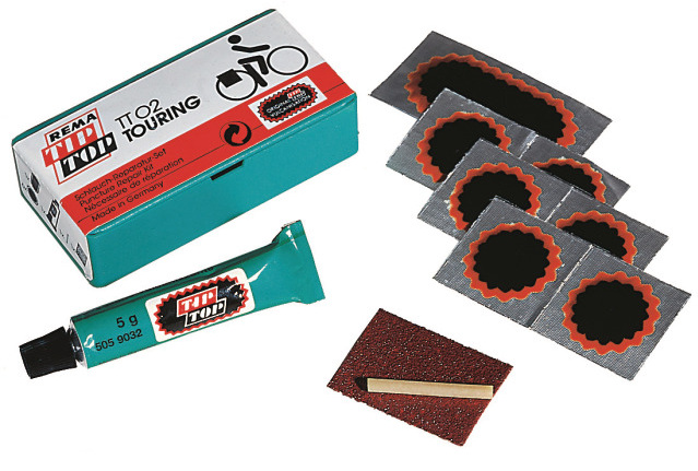 Inhalt: 6 Flicken F1, 1 Flicken F2, 5 g Vulkanisierlösung, 1 Ventilschlauch + Raupapier