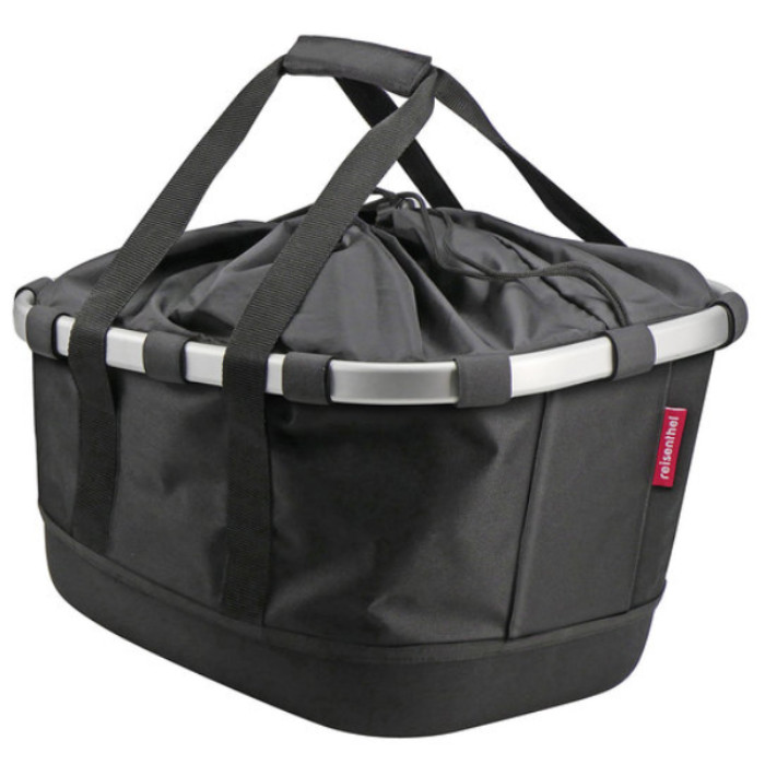Leichter, längs orientierter Reisenthel Stoffkorb für Gepäckträger mit stabilem Thermoformboden und flexiblen Tragegurten. Die klassische, nach vorne abfallende Korbform schafft Platz für den Sattel und Bewegungsfreiheit für den Radler. Ein Kordelzug schützt den Inhalt vor dem Herausspringen, ein Reißverschlussfach im Inneren bietet Platz für Schlüssel und Wertsachen. Die Versteifungselemente lassen sich heraus nehmen, so dass der Korb flach und platzsparend verstaut werden kann.