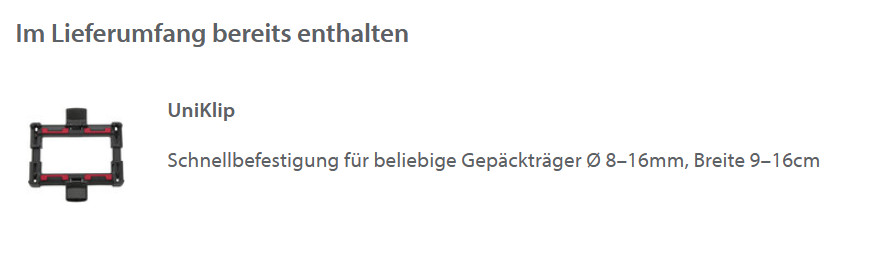 Unsere Taschen, Boxen und Textilkörbe mit Uniklip können auf beliebigen Gepäckträgern verwendet werden. Breite einmalig auf Gepäckträger einstellen. Zubehör aufsetzen – Klip umlegen – fest !