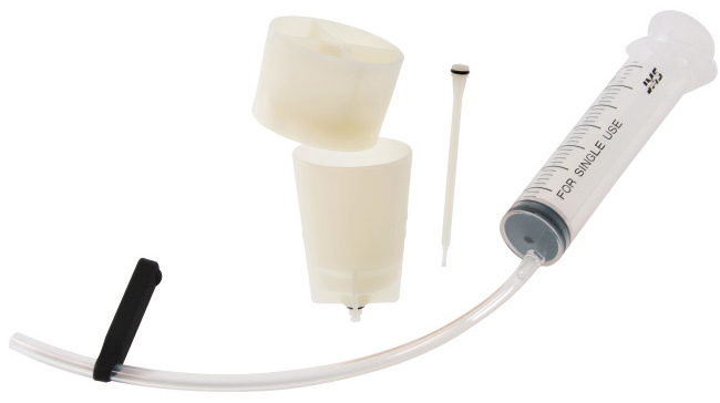 Basis-Entlüftungsset zum Entlüften von SHIMANO-Scheibenbremsen mit TrichterPraktischer, durchsichtiger Trichter und SockelLeitungsclip hält die Leitung am Nippel