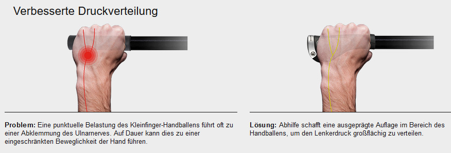Die Griffe der GP1 - Serie bieten ein Maximum an Komfort und bestmoegliche Druckverteilung. Geschmiedeter Alu - Klemmring fuer schnelle und verdrehsichere Montage. Einstellung des individuellen Handauflagewinkels durch einfaches Drehen des Griffs moeglich.