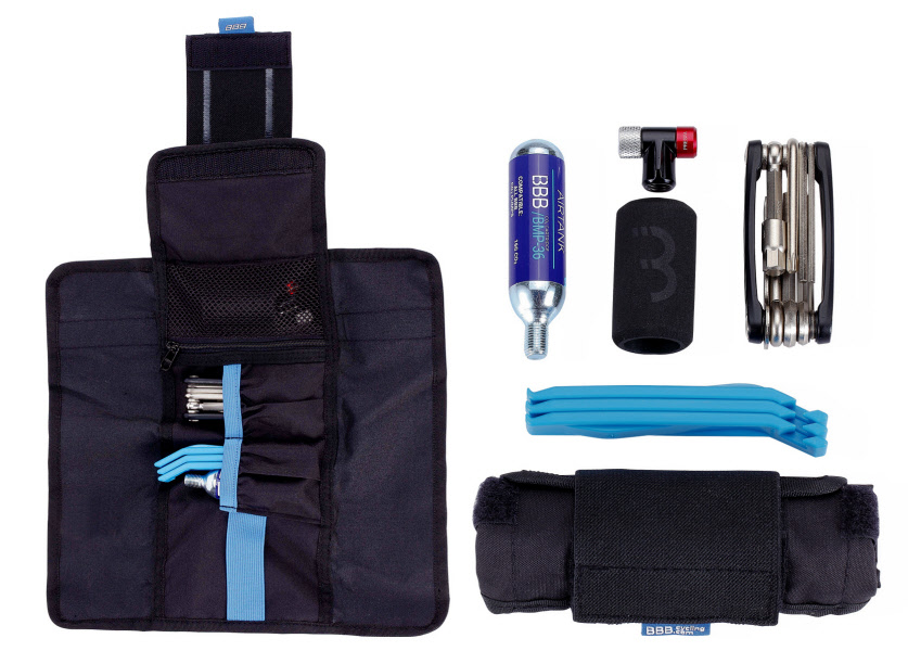 Multifunktions-Werkzeugrolle mit Platz für einen Ersatzschlauch, Werkzeuge, CO2-Kartuschen und einer Tasche für Kleinteile. Verwendbar als Satteltasche, Rahmentasche oder Organiser. Inklusive: BTL-41S Maxifold S. BTL-81 EasyLift Reifenheber 3Stk./Set. BMP-32 AirSpeed, CO2 Kartuschen inklusive.